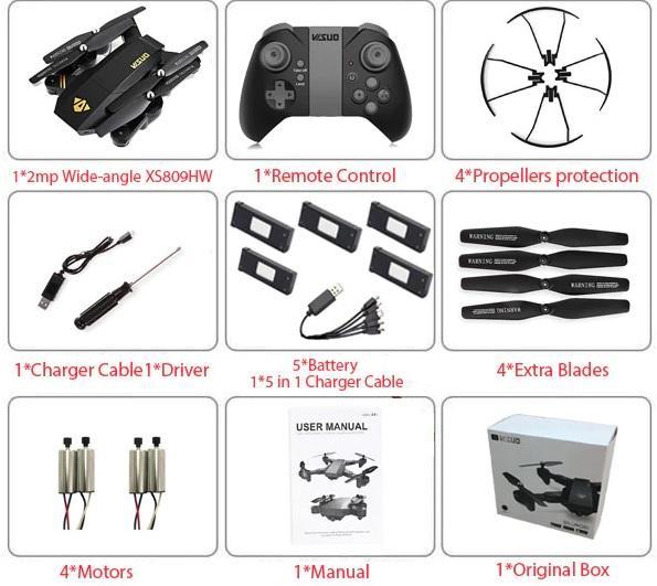 VERSÃO PREMIUM: 1 DRONE + 1 CONTROLE + 4 PROTEÇÃO + CABO CARREGADOR + 5 BATERIA + 4 ELICE EXTRA + 1 CHAVE + 1 MANUAL + 4 MOTORES + CAIXA